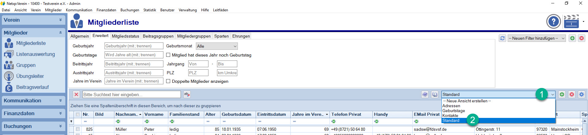 Die Such- und Filterfunktion von Netxp:Verein ist sehr umfangreich. Sie können nach beliebigen Kriterien suchen, Ansichten festlegen, Filter anlegen und diese für eine spätere Nutzung abspeichern.