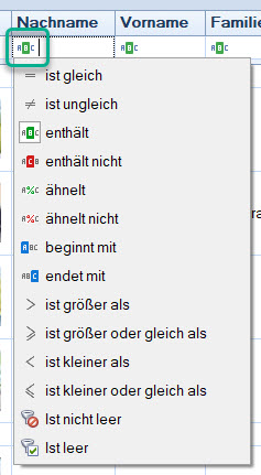 Unterhalb der Spaltennamen befinden sich Eingabefelder. Links in den Feldern sehen wir die Operanden. Durch einen Linksklick auf die Symbole wählen wir aus einer Liste möglicher Optionen aus.